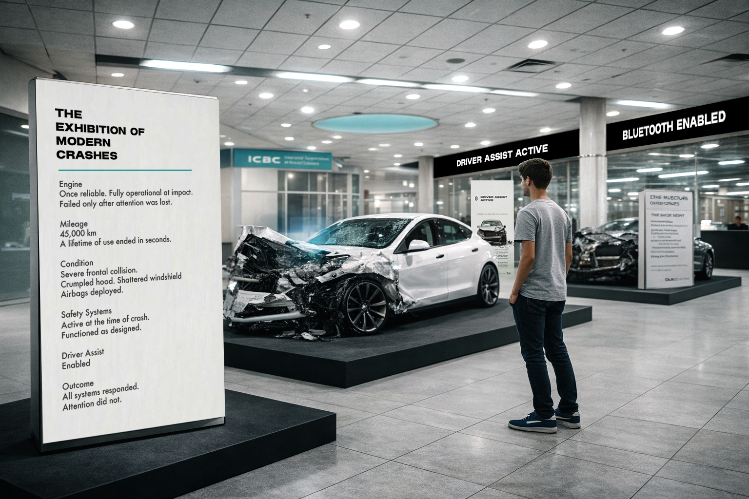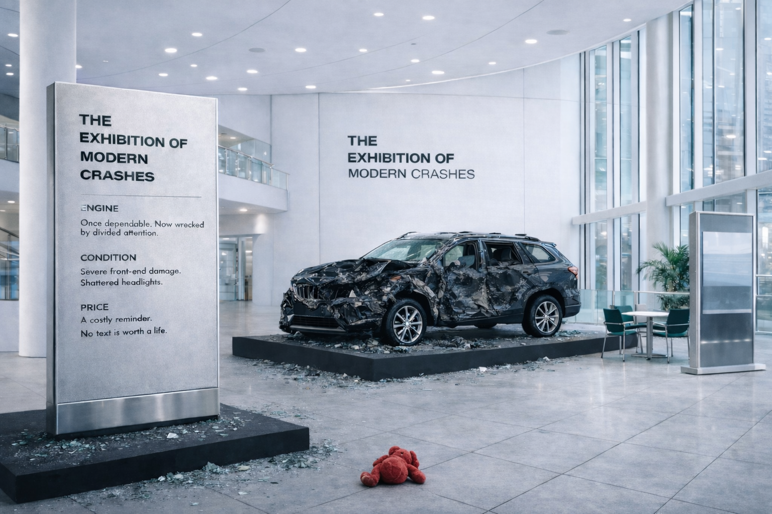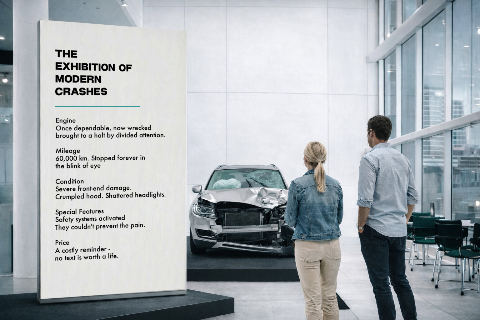 This campaign extends into a physical exhibition where crashed vehicles are displayed like showroom models, with spec panels revealing distraction instead of performance. Immersive scenes turn observation into reflection, reinforcing one message: safety isn’t a feature, it’s a responsibility.