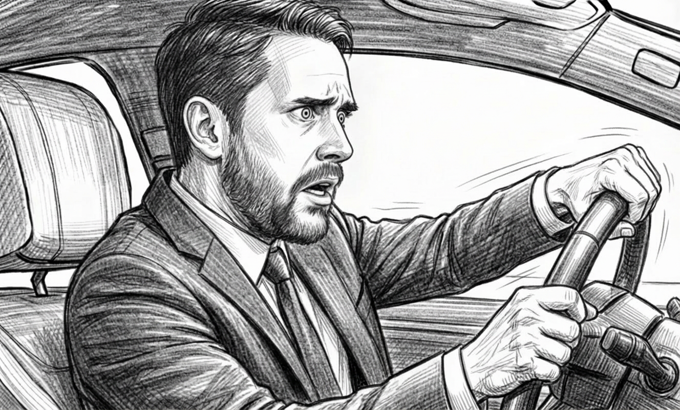 Fear flashes across his face. A sudden, violent movement —He jerks the steering wheel, trying to avoid the collision.