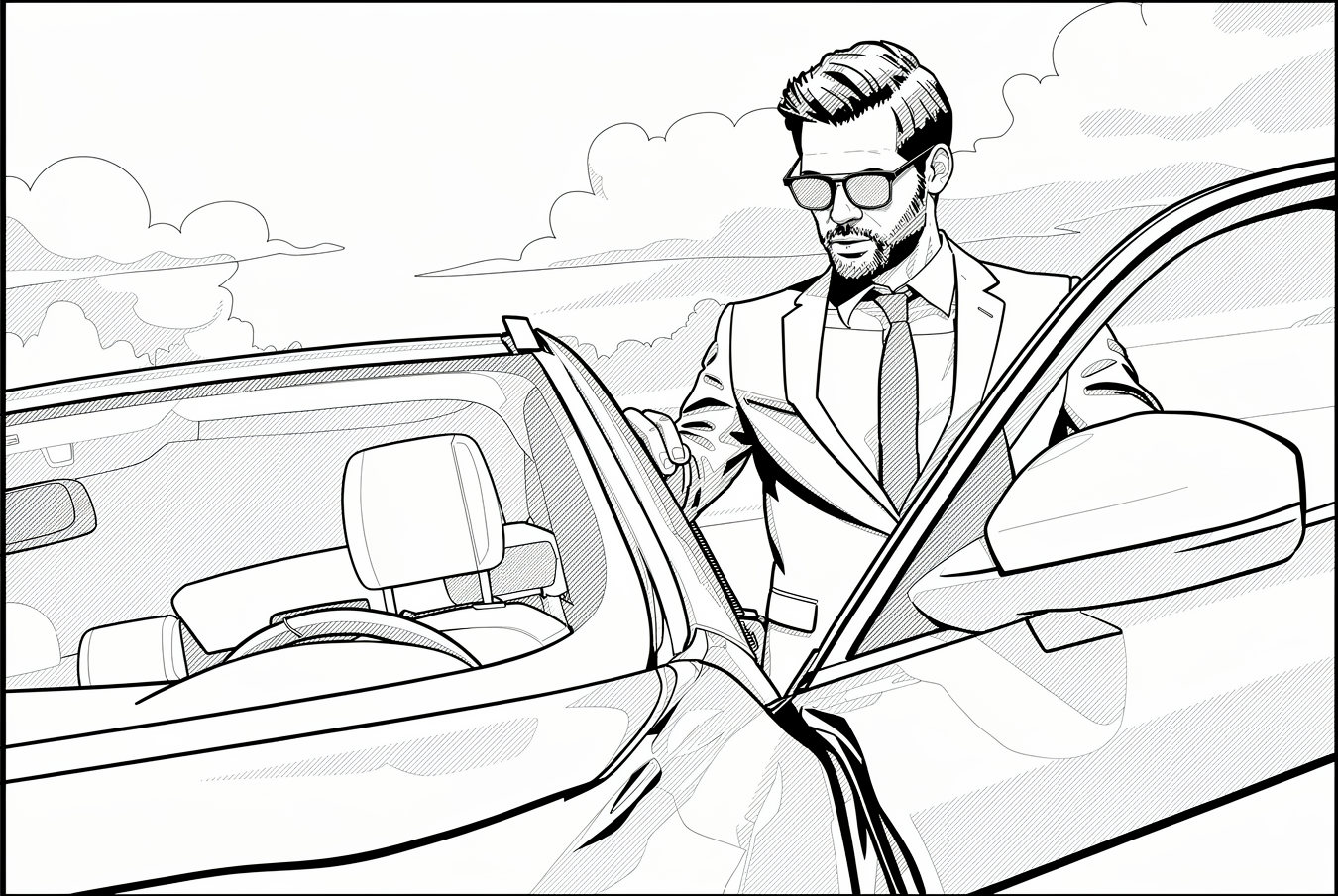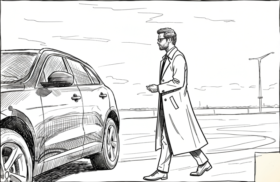 A tracking shot of a well-dressed man in a perfectly tailored suit walking toward a modern luxury car. Every movement is precise.