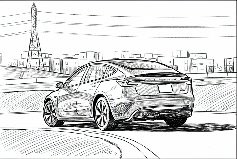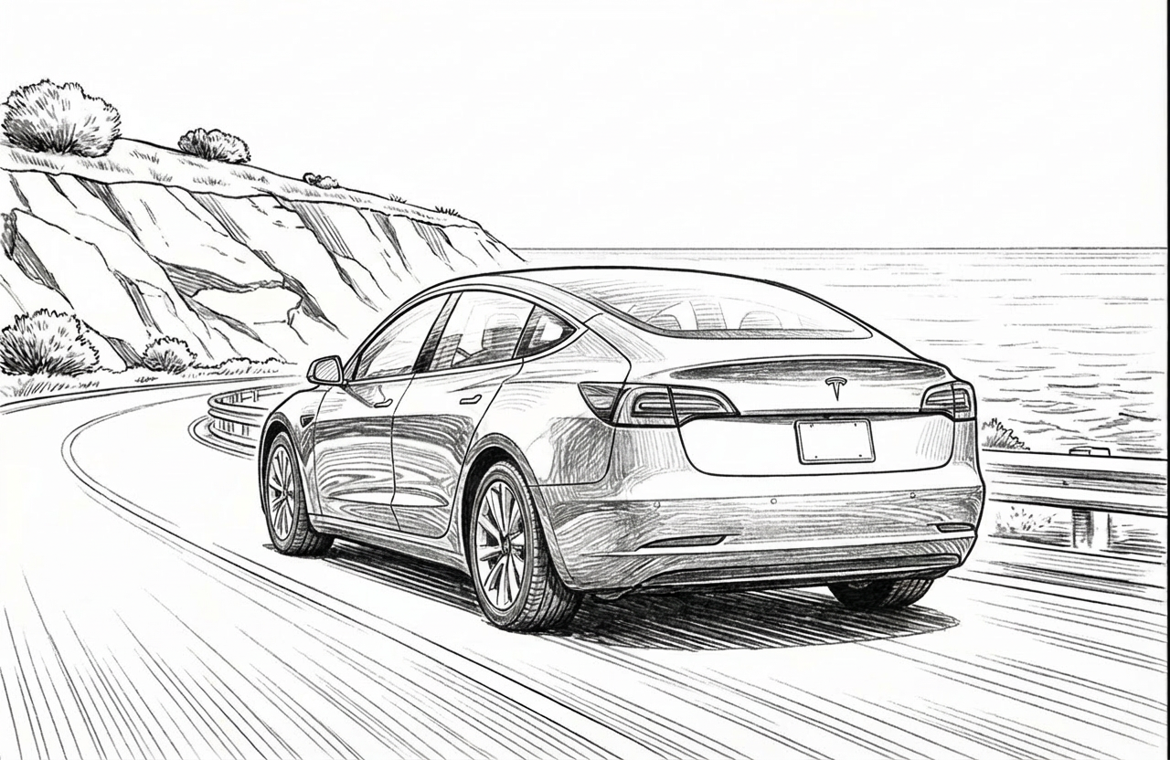 A smooth top-down drone shot.The car moves along a wide, clean road. Centred. Calm. Controlled. Perfectly centred. No resistance. No interruptions.