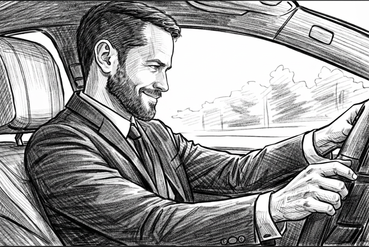 The car glides through a quiet, upscale street. Hands steady on the steering wheel.