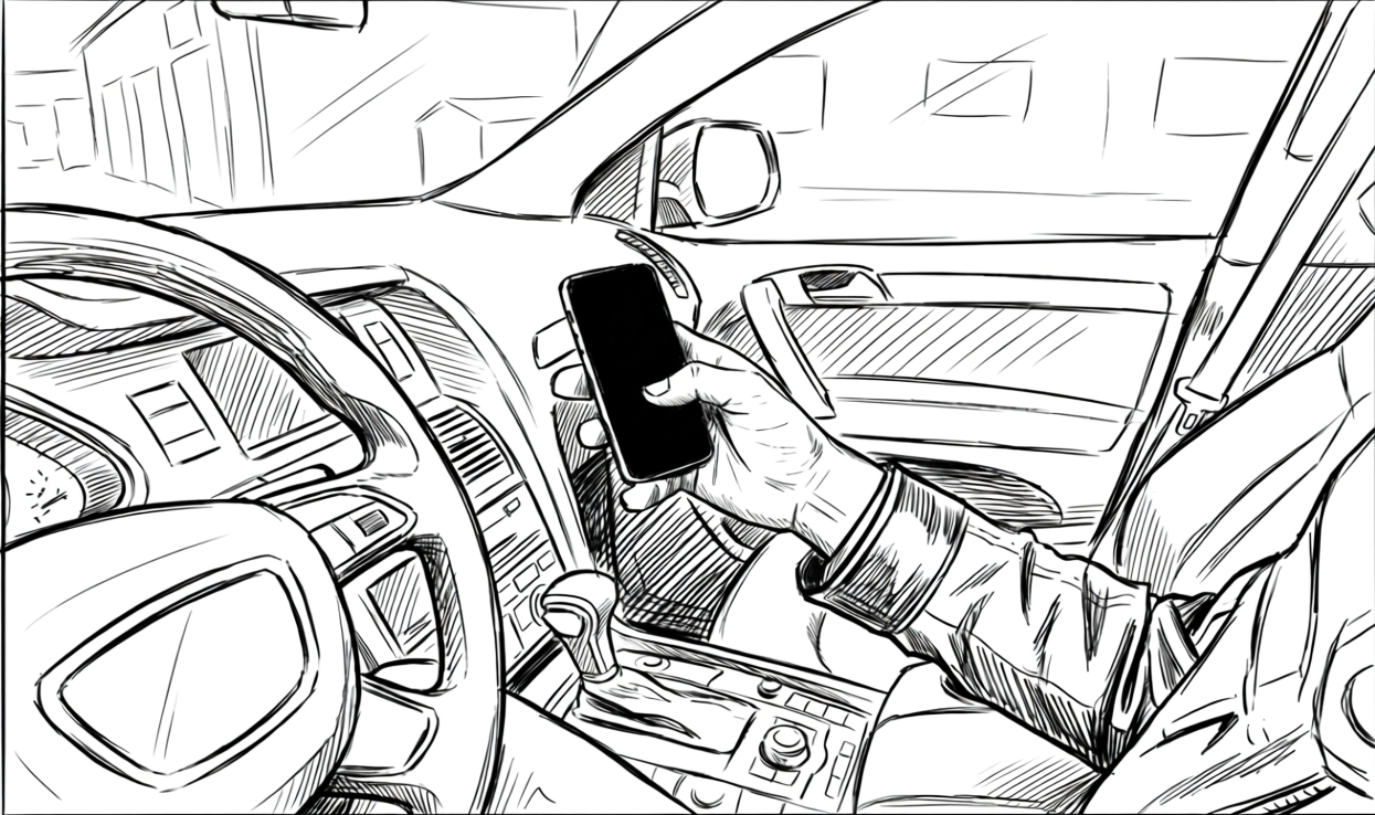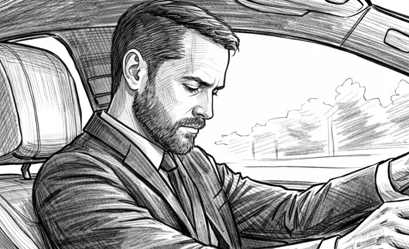 The driver exhales. Reaches for his phone.