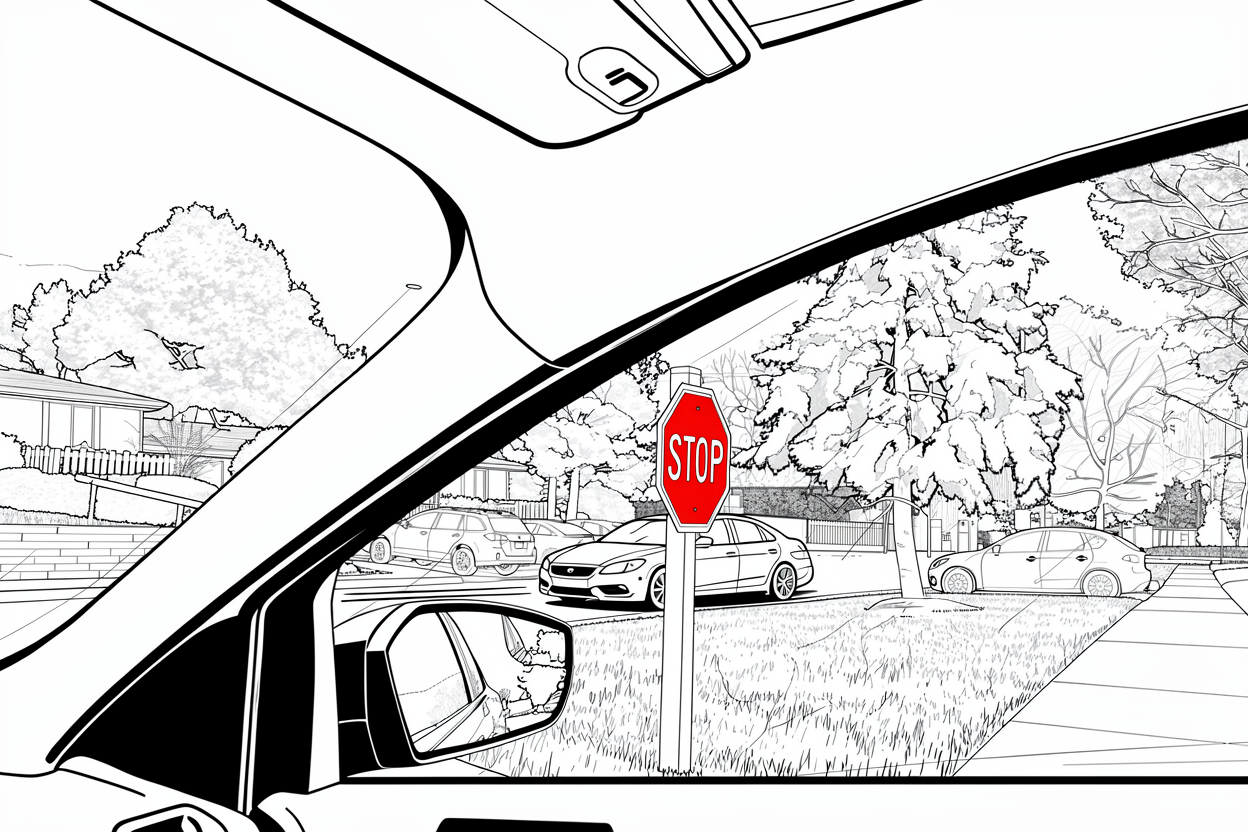 The road ahead. A STOP sign enters the frame — unnoticed.