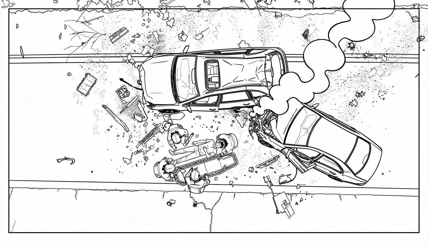 Aerial drone shot of the crash site. Two cars locked in stillness. Emergency lights reduced to small pulses.