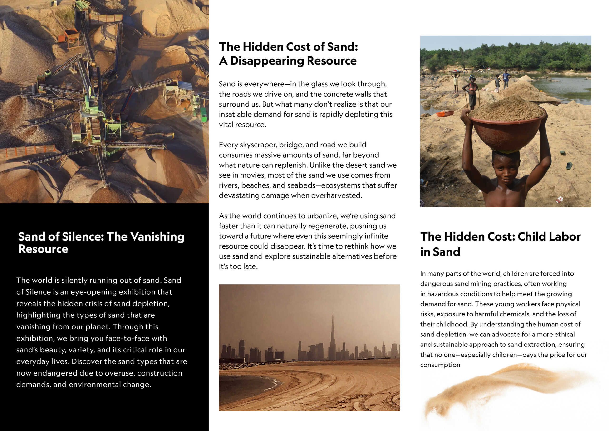 Through global sand types and a feature-length documentary addressing issues such as illegal mining, the exhibition reveals how human consumption is destabilizing ecosystems and communities..
