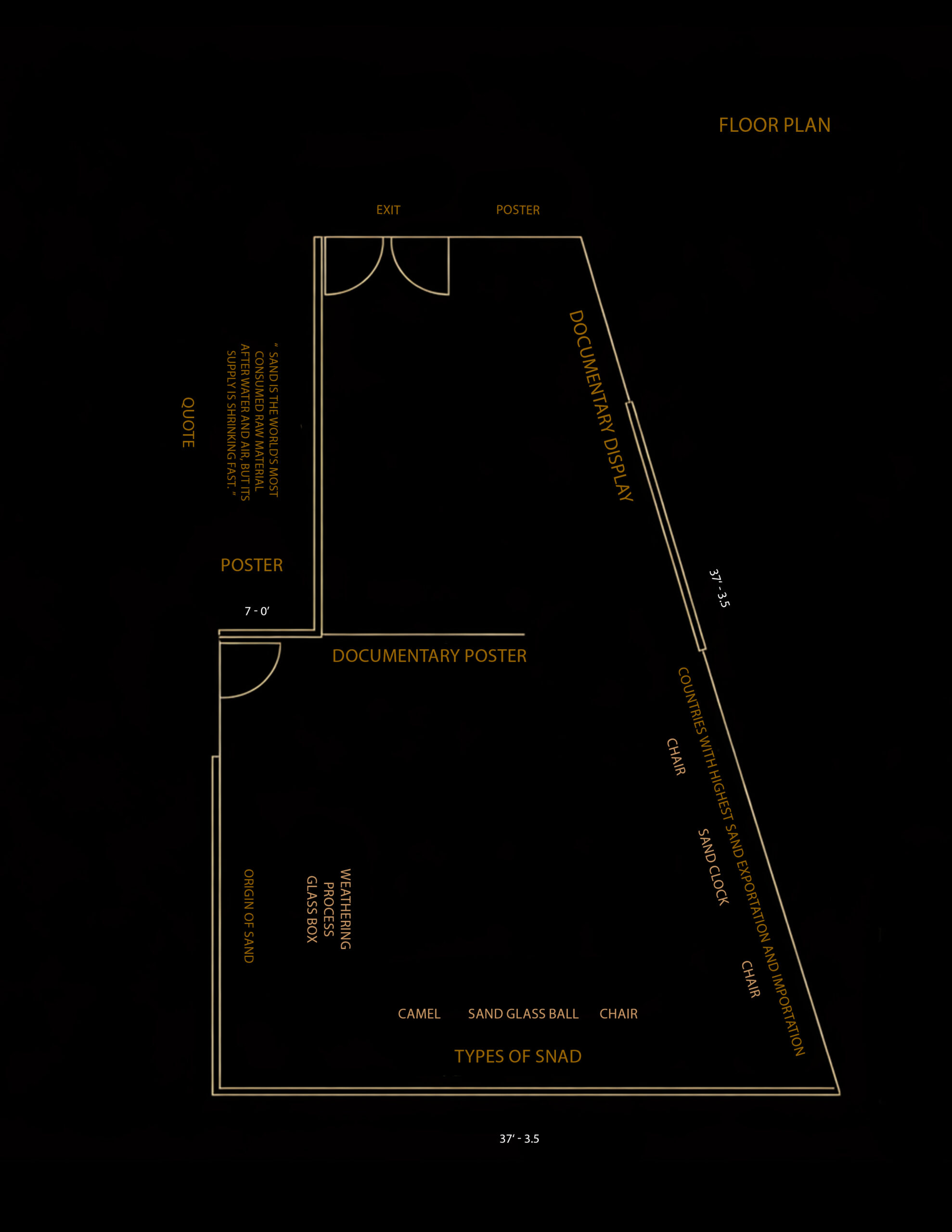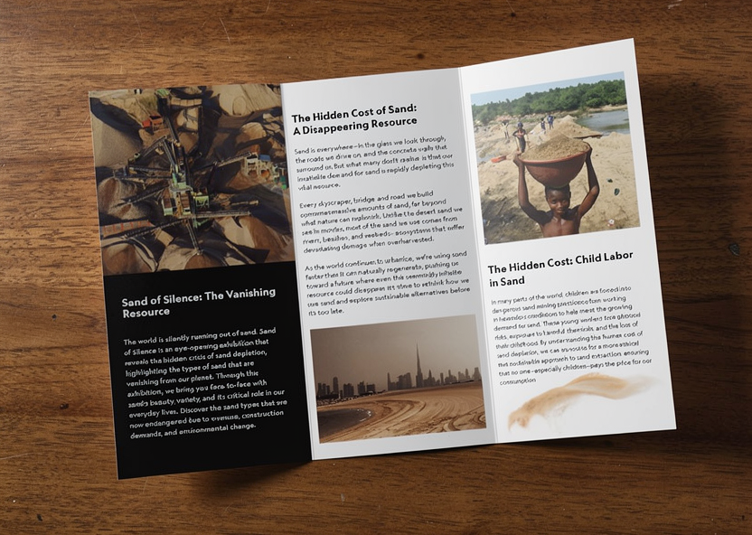 I tilted the upper parts of the letters to resemble the silhouette of buildings, symbolizing humanity’s dependence on sand for construction. Additionally, I applied a grain effect to the bottom of the letters to give the impression of sand gradually disappearing, mirroring the exhibition’s central theme.