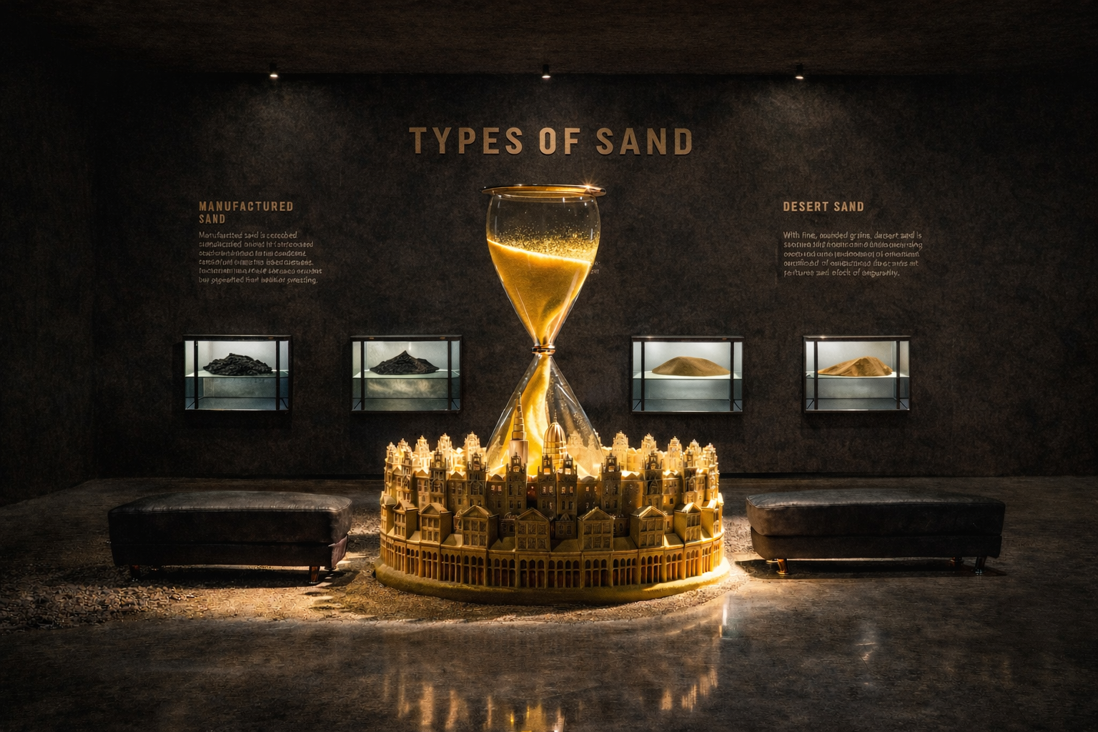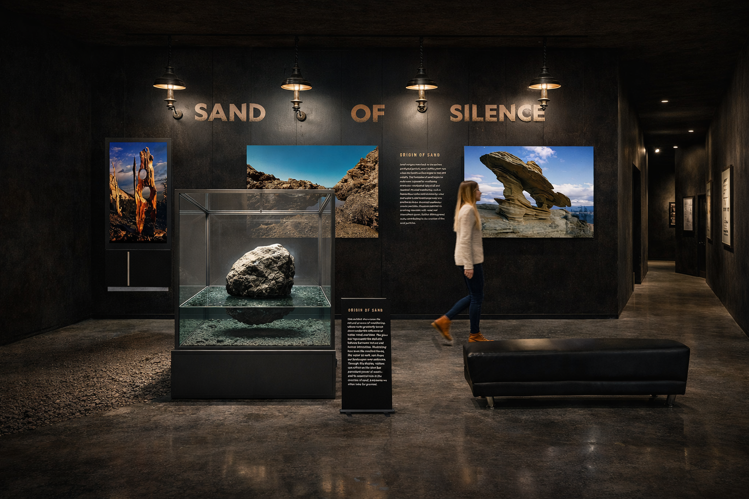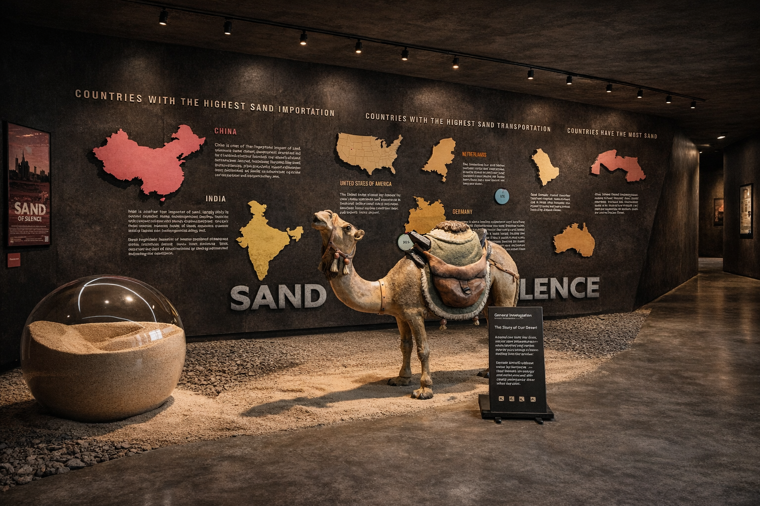 Sand of Silence is an exhibition examining sand depletion as a global crisis. It explores sand not as a neutral material, but as a finite system supporting modern construction, technology, and cities.